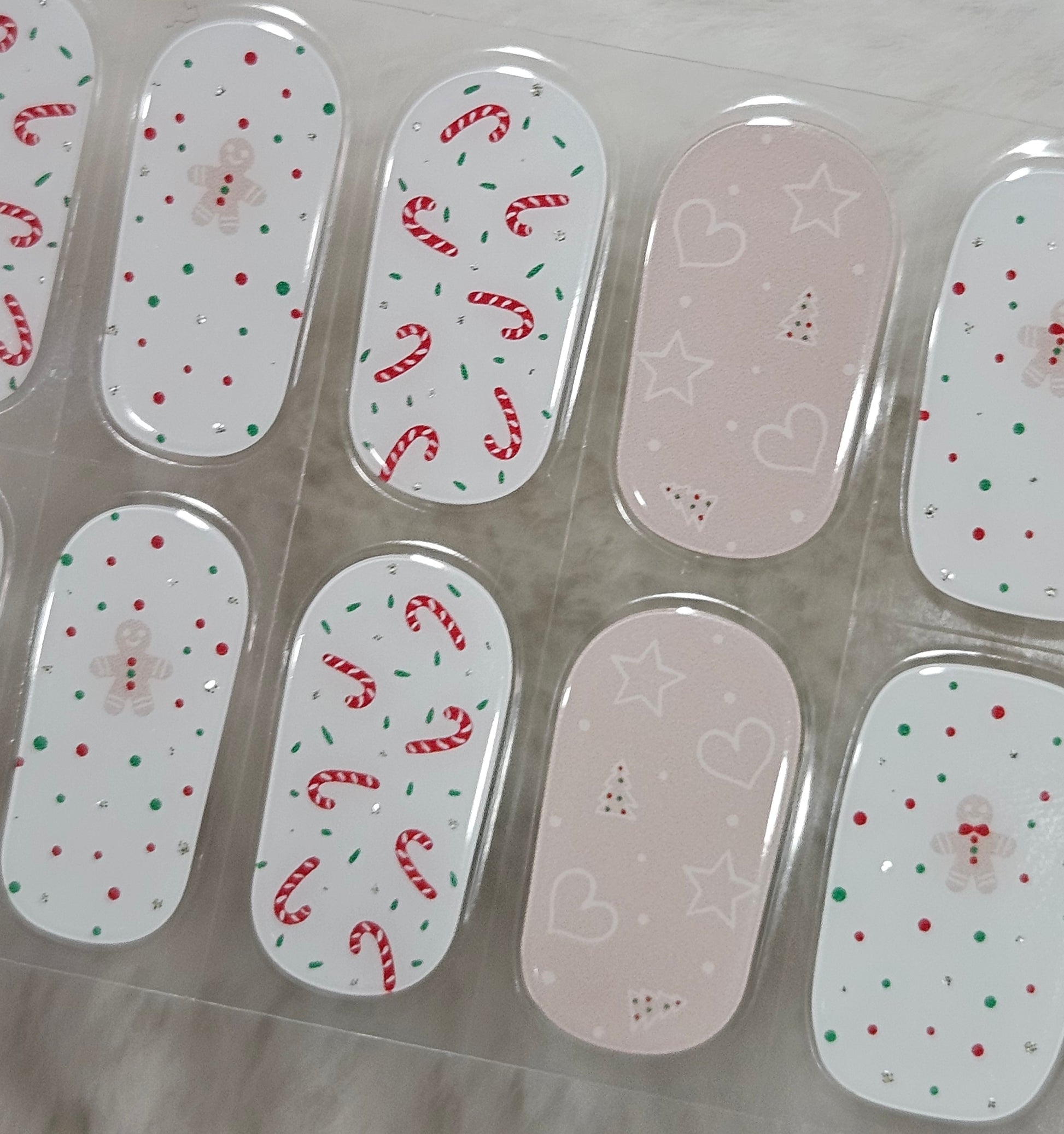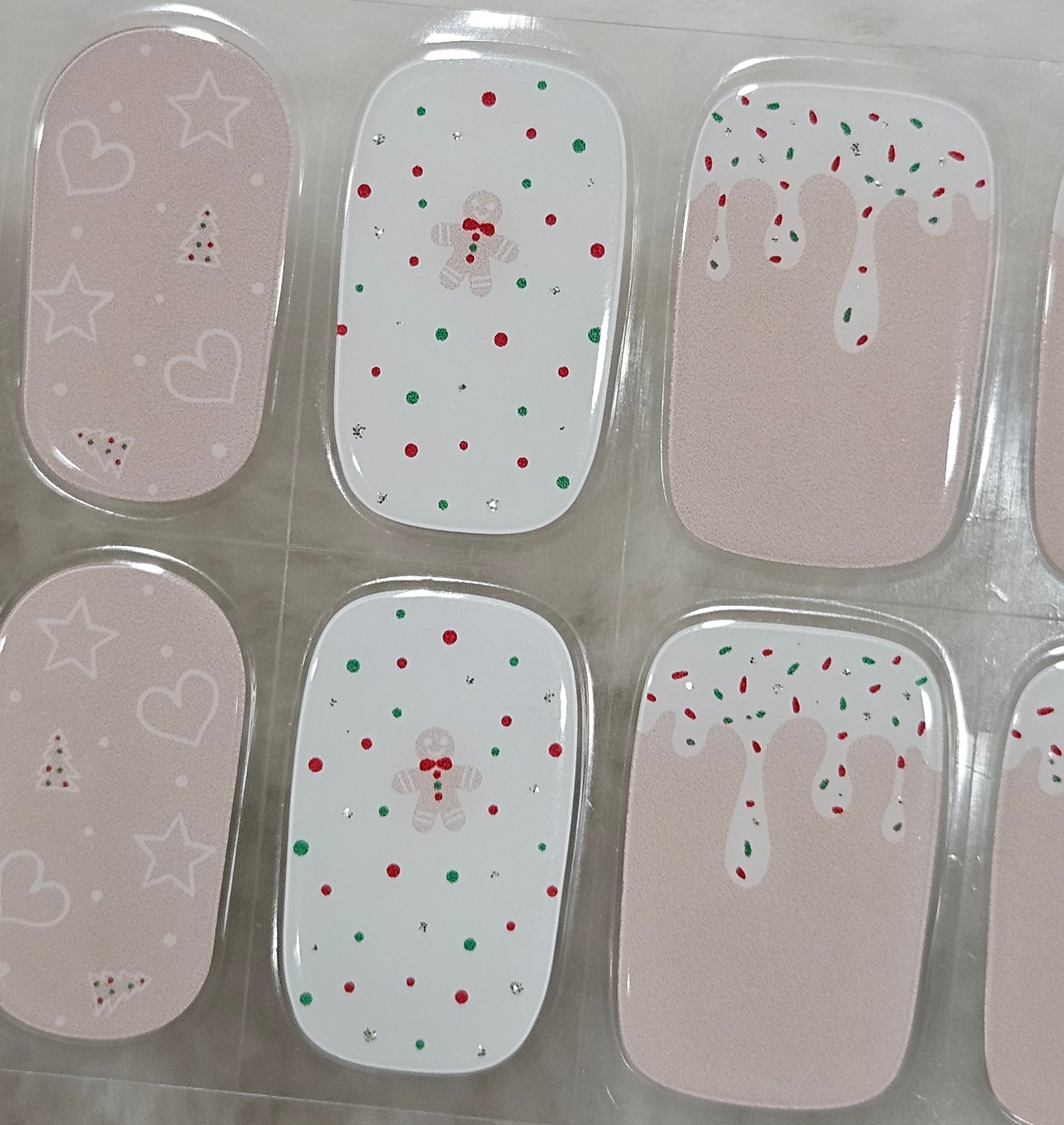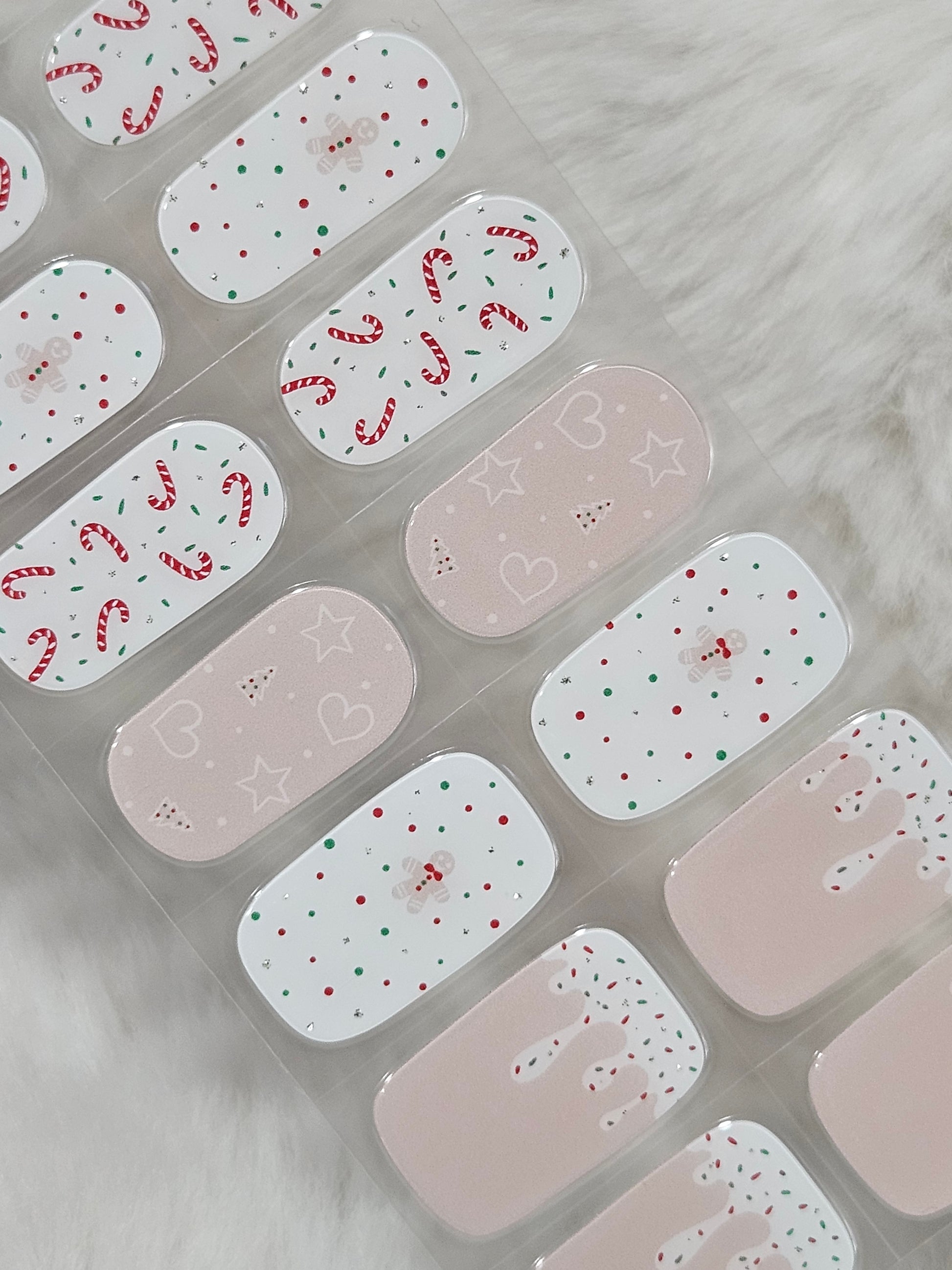 Glossy, Glitter, Pink, Red, Green, White, Christmas, Gingerbread Man, Candy Cane, Trees, Frosting, Sprinkles, Polka Dots, Holiday