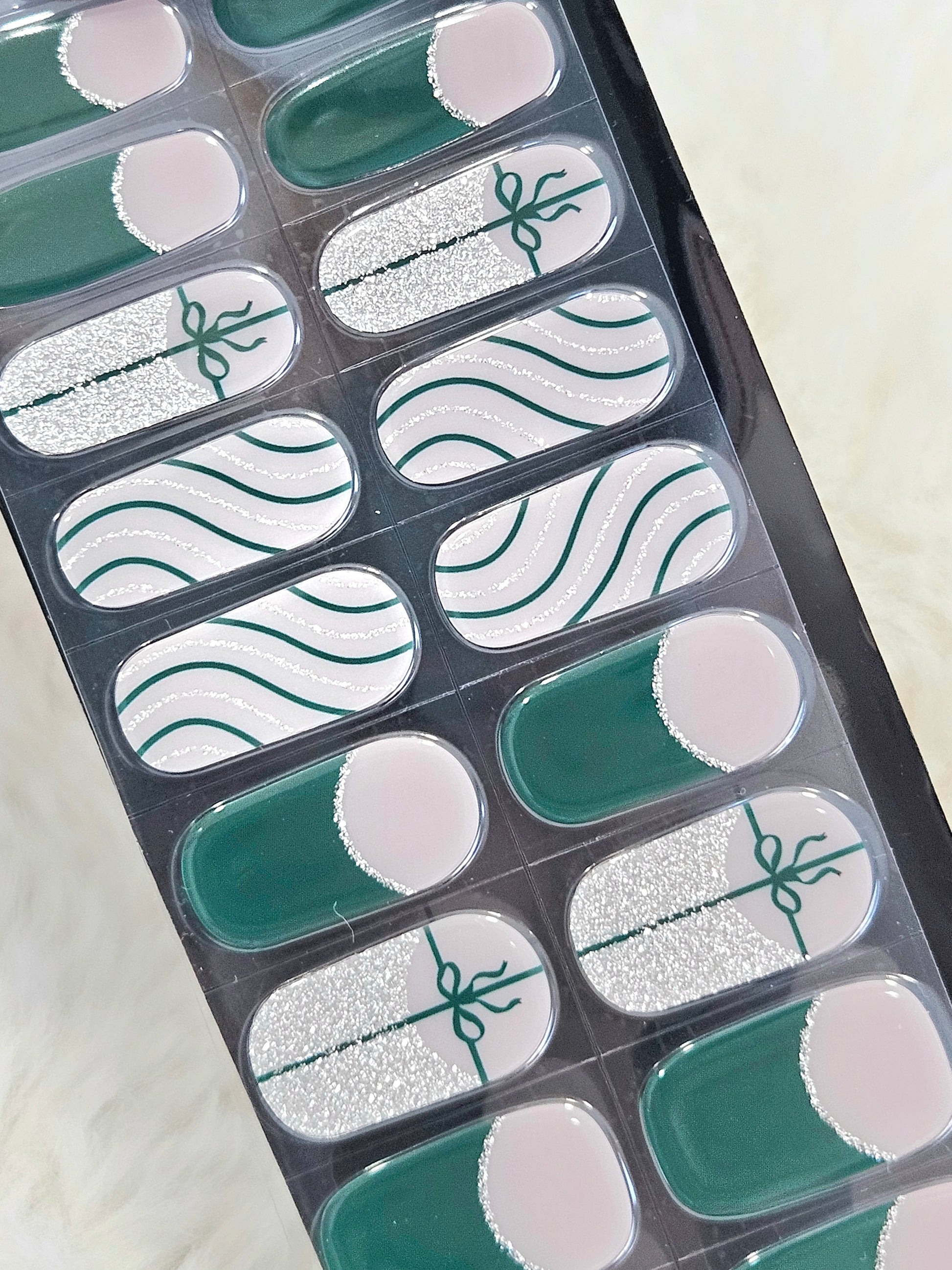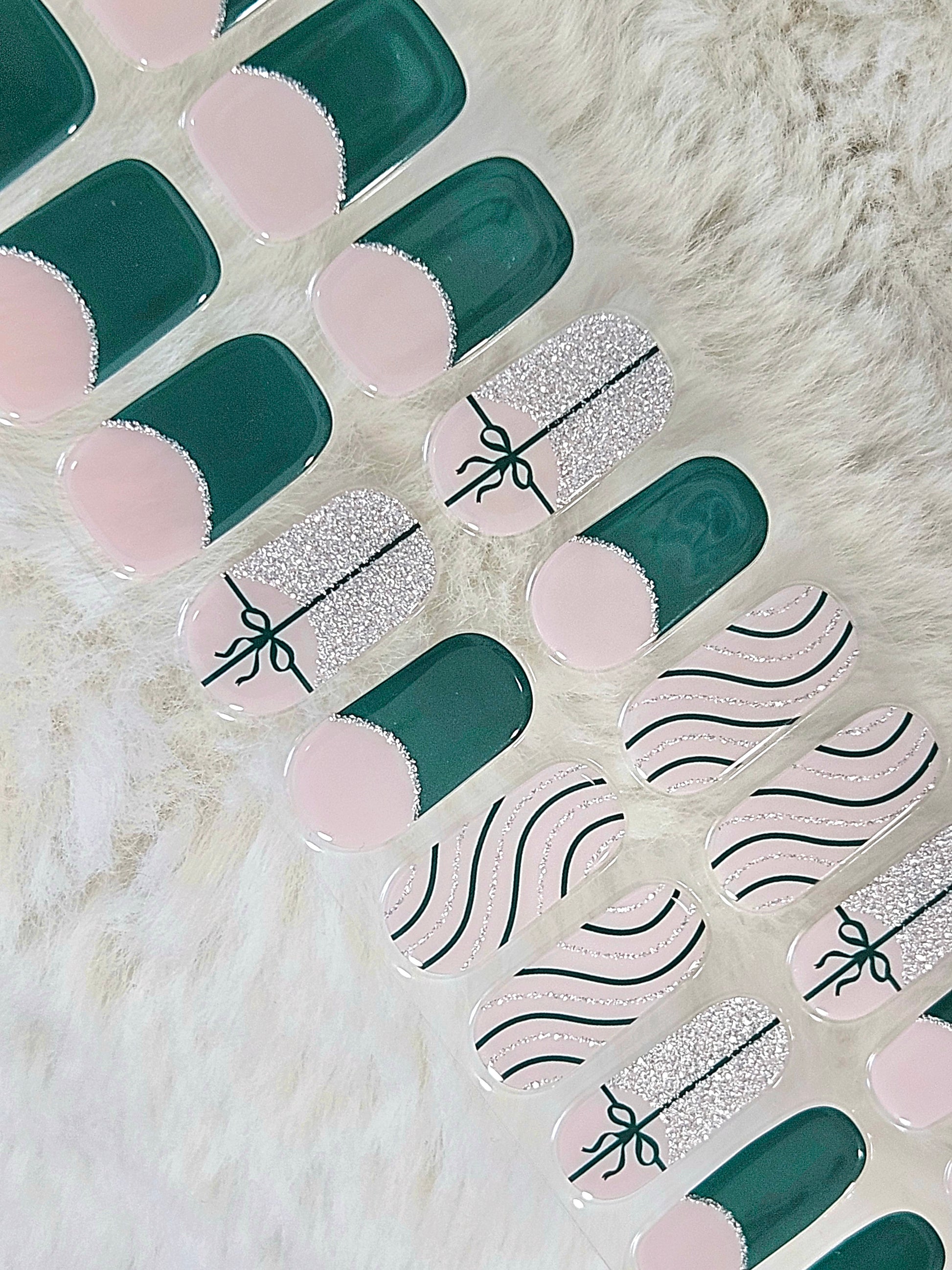 Glossy, Glitter, Milky, French Manicure, Green, Silver, Bow, Holiday, Christmas